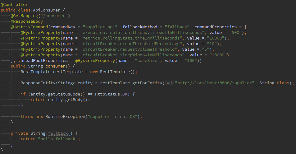 이제 Hystrix를 사용할 준비가 다 끝났습니다. 적용하고 싶은 메서드에 @HystrixCommand 애너테이션을 달고 전략에 맞는 설정값을 주면 됩니다.